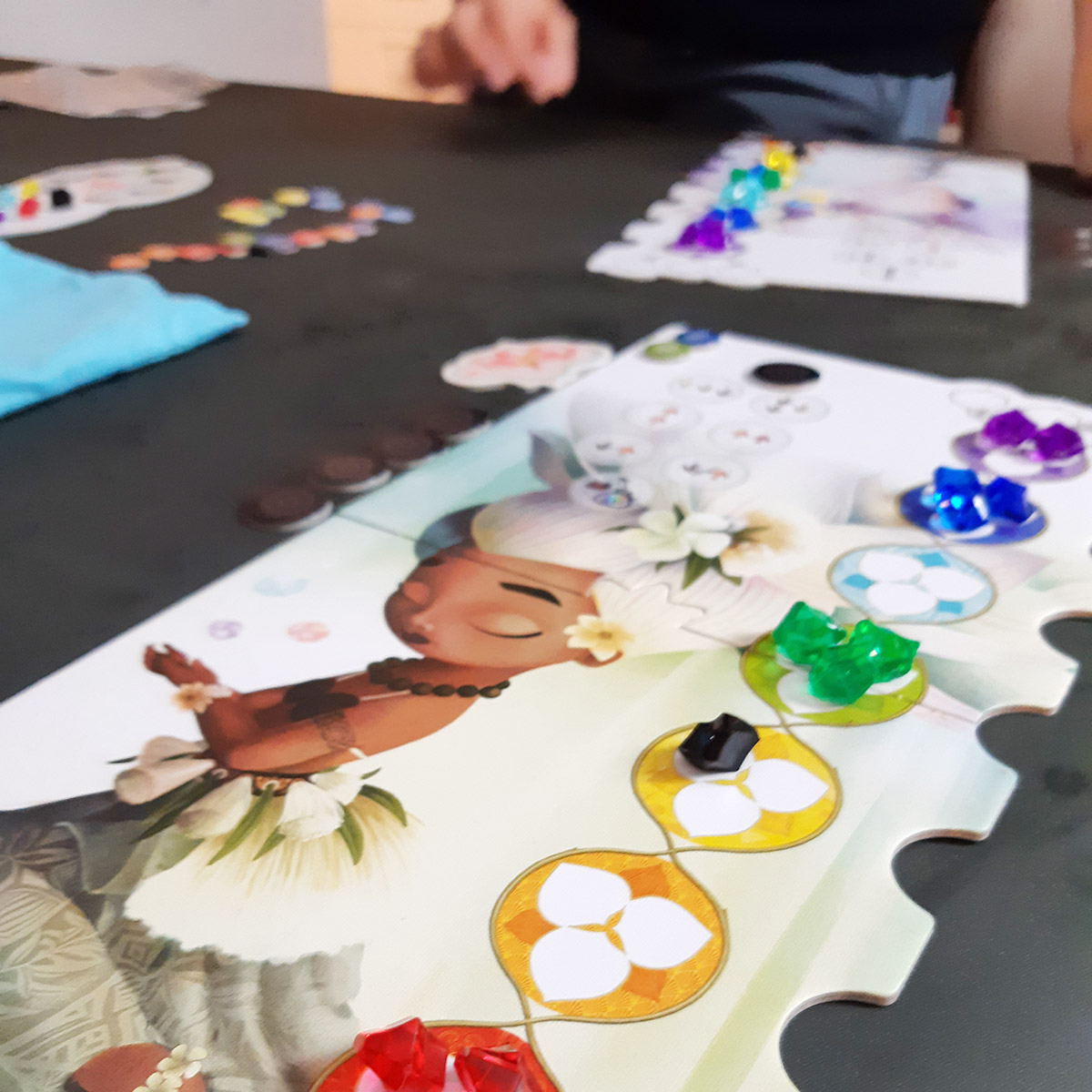 Lea schlägt das Spiel "Chakra" vor. Ein schönes, flott erklärtes Spiel, bei welchem es darauf ankommt, bunte Kristalle ins Gleichgewicht zu bewegen. Man versucht dabei seine Aktionssteine möglichst geschickt einzusetzen, um möglichst wenige Züge mit "Meditation" (Steine zurücknehmen) zu verbringen.