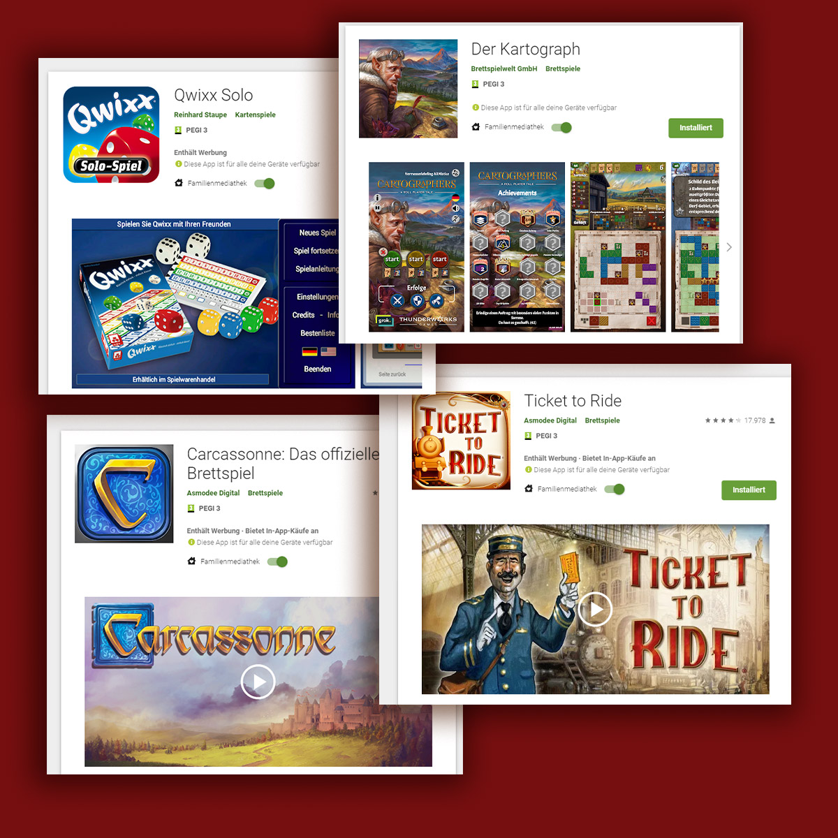 Und zwar sind dies u. a. Der Kartograph, Carcasonne, Qwixx oder Zug um Zug mit der App oder Clever hoch Drei, Tippi Toppi und Ganz schön Clever online.