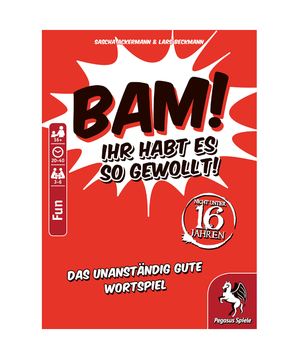 In diesem Party-Spiel füllt ihr die Lückentexte auf Karten mit passenden Begriffen. Dabei müsst ihr euch nicht um einen grammatikalisch möglichst korrekten oder gar inhaltlich sinnvollen Satz bemühen. Es gilt einzig und allein, den BAM!-Master zu überzeugen, dass euer Begriff der originellste und witzigste ist.