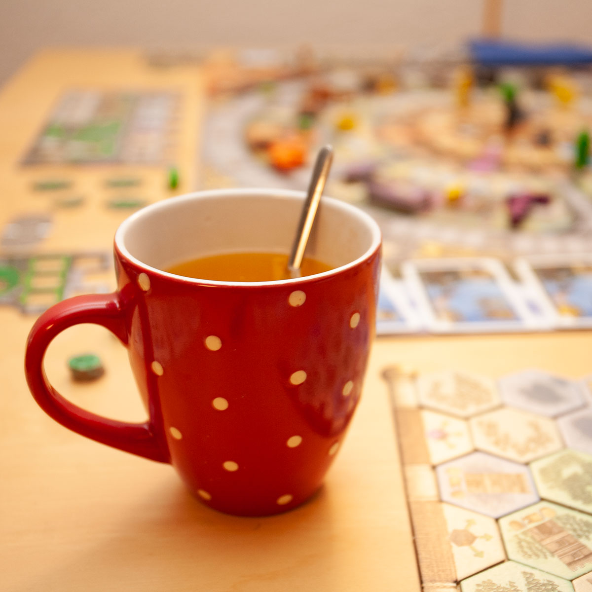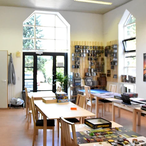 Ein Ort, an welchem zwischen den mit bunten Spielen bestückten Regalen, in aller Öffentlichkeit, Kaffee getrunken und gespielt werden kann, wo die Tische genug Platz bieten für ein opulentes Spielbrett, einen Haufen Ressourcen und gleichzeitig auch Becher, Tassen und vielleicht Knabbereien, wo man nicht schief angeguckt wird, wenn man stundenlang den Tisch mit Karten, Würfeln und Pöppel belegt und wo man auf Gleichgesinnte, manchmal gar auf neue Freunde trifft…