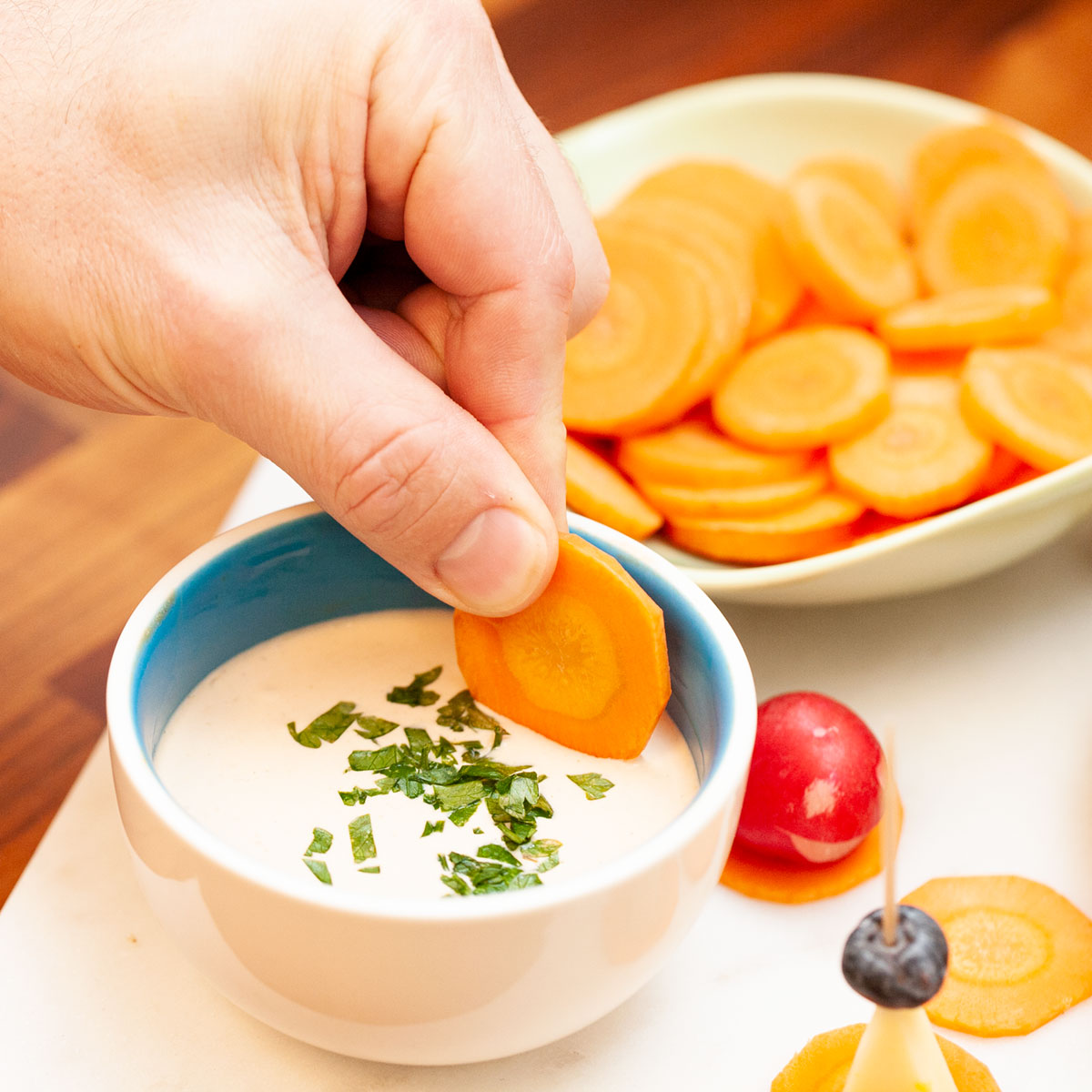 Grosse Karotten schälen und in gleichmässige Rondellen schneiden. Schön sehen auch verschieden farbige Rüebli aus. Für den Dipp 2 EL sauren Halbrahm, 2 EL griechischer Natur-Joghurt, etwas Senf, Kräuter und Salz anrühren.