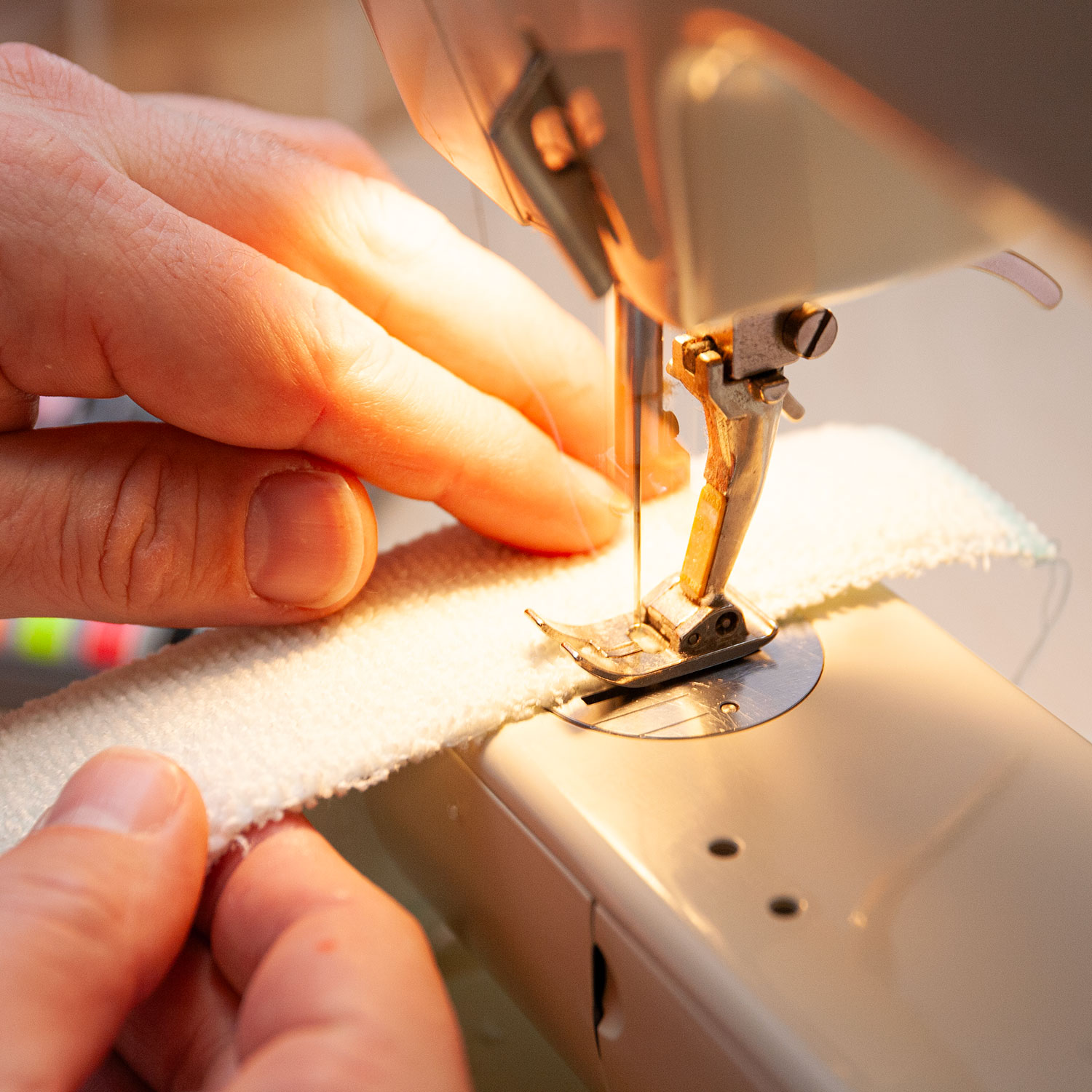 Eine schöne Fadenfarbe wählen, entweder gleich wie der Stoff oder ein Kontrast. Vorsichtig der Kante entlang nähen. Andreas hat einen engmaschigen Zickzackstich gewählt. Wenn Du einen Fancy-Zierstich hast, kannst Du natürlich auch davon Gebrauch machen.